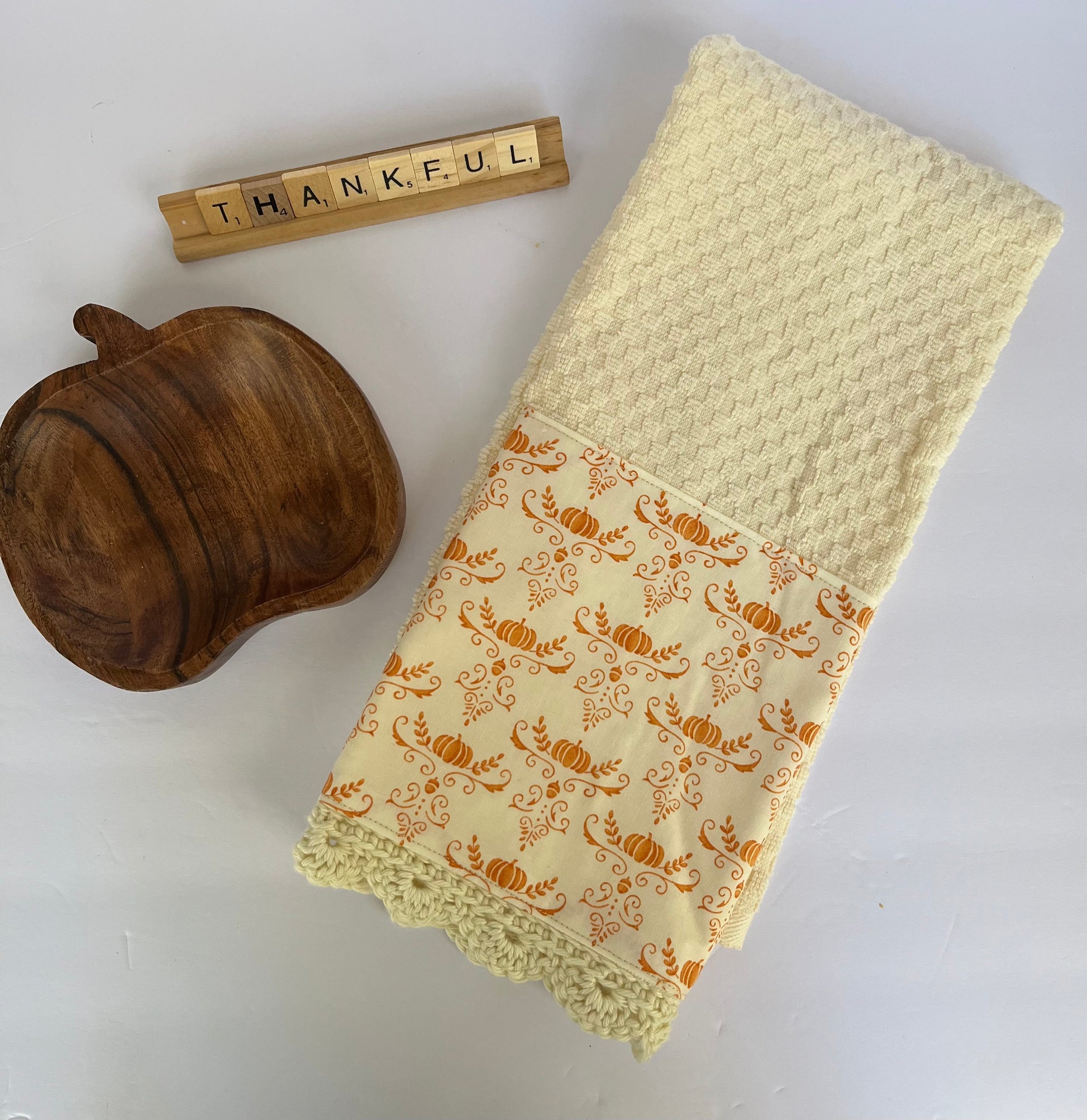 Our kitchen towels are handmade with seasonal fabrics and crocheted detail. Either print - floral or pumpkin - will look great throughout the fall season!